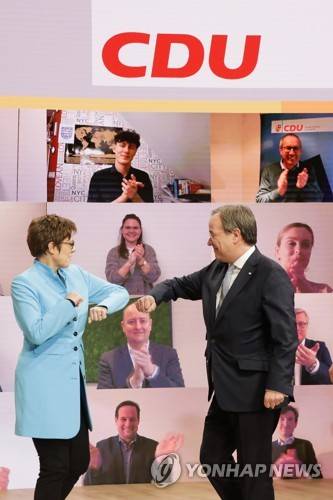 The new elected Christian Democratic Union, CDU, party chairman Armin Laschet, right, greets by outgoing chairwoman Annegret Kramp-Karrenbauer, left, after the voting at a digital party convention in Berlin, Germany, Saturday, Jan. 16, 2021. The party of German Chancellor Angela Merkel decided on a successor for the outgoing chairwoman Annegret Kramp-Karrenbauer, left, at the convention. (AP Photo/Markus Schreiber)