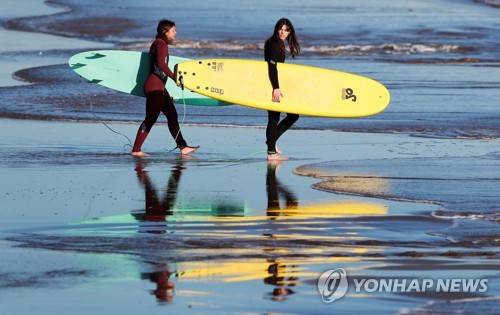 epa08941234 Two surfers are preparing to enter the waters of Malvarrosa beach, in Valencia, Spain, 16 January 2021. Spain's State Agency of Meteorology (Aemet) forecasts for 16 January foresees slightly cloudy or clear skies, with cloudy intervals in the first hours in the extreme north and temperatures with few changes except decreases in the maximums in the south. EPA/KAI FOERSTERLING