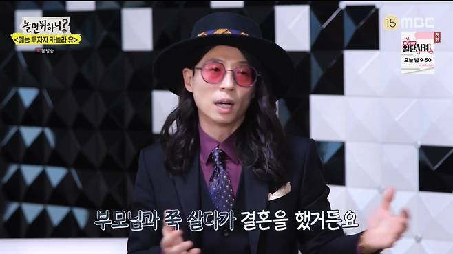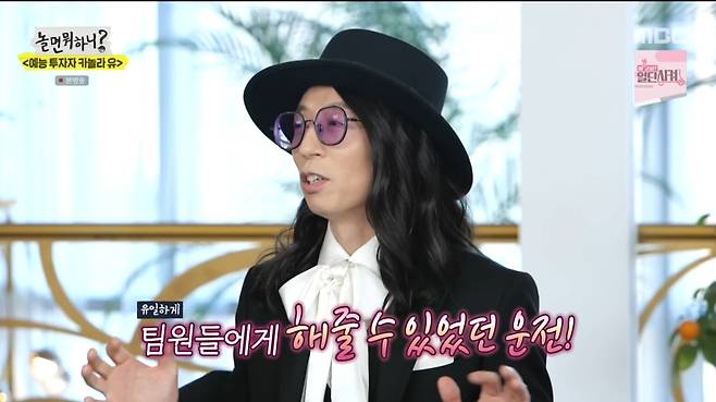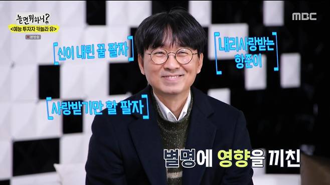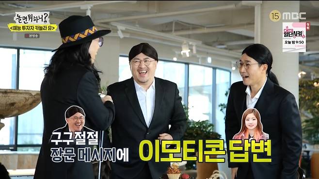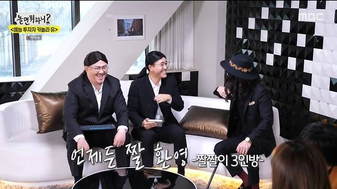 유재석이 선택한 '예능 우량주'와의 만남도 이어졌다. 첫 주인공은 장항준 감독. 최근 아내 김은희의 인기로 행복한 인생을 살고 있는 그는 '신이 내린 꿀 팔자' '사랑받기만 할 팔자' 등의 별명을 얻기도 헀다. 또 와인을 마시기 시작했다는 그는 "왜 지식인들이 와인을 탐닉했는지 알겠다"면서 함박 웃음을 지었다. 첫 명품 슈트를 입고 나와 자랑한 장 감독은 "이 옷도 아내가 골라 준 거"라며 애정을 드러냈다.