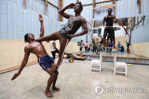 epa08941284 Kenyan acrobatic members of the Mighty Jambo Circus Academy take part in their training routine at the academy in Nairobi, Kenya, 13 January 2021 (issued 16 January 2021). The Kenyan circus academy resumed back to their daily exercise routine after months of closure since the coronavirus pandemic started. The academy that depends on performances in Europe, especially Spain, has been forced to turn to local performances. With the launch of COVID-19 vaccinations across Europe during the second wave of the pandemic they hope to be able to go back to normal. EPA/Daniel Irungu ATTENTION: This Image is part of a PHOTO SET