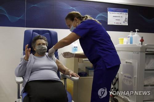 epa08941338 Mrs. Irene, 91 years old receives an injection with a dose of a COVID-19 vaccine Evangelismos hospital, in Athens, Greece, 16 January 2021. The vaccination of individuals over 85 years old with the first of two shots began in Greece on Saturday 16 January 2021, as that of health staff at the front lines of the fight against the coronavirus continues. EPA/ALEXANDROS VLACHOS