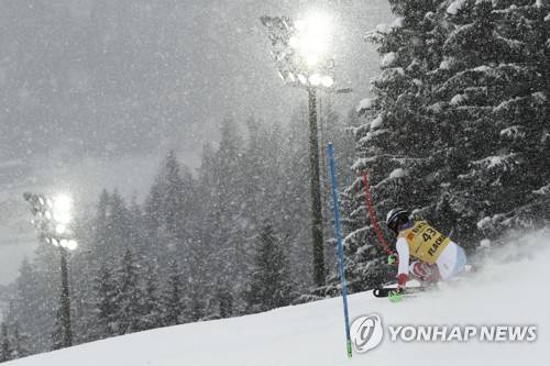 Switzerland's Luca Aerni competes in an alpine ski, men's World Cup slalom in Flachau, Austria, Saturday, Jan. 16, 2021. (AP Photo/Gabriele Facciotti)