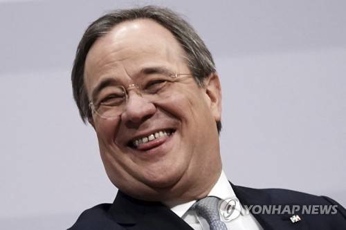The new party leader Armin Laschet sits on the podium at the digital federal party conference of the CDU and laughs in Berlin, Germany, Saturday, Jan. 16, 2021. German Chancellor Angela Merkel’s party has elected a new leader on Saturday, eight months before voters decide who will succeed Merkel in a national election. (Michael Kappeler/dpa via AP)