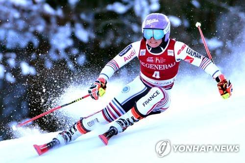 epa08941357 Tessa Worley of France clears a gate during the first run of the women's Giiant Slalom race of the FIS Alpine Skiing World Cup in Kranjska Gora, Slovenia, 16 January 2021. EPA/IGOR KUPLJENIK