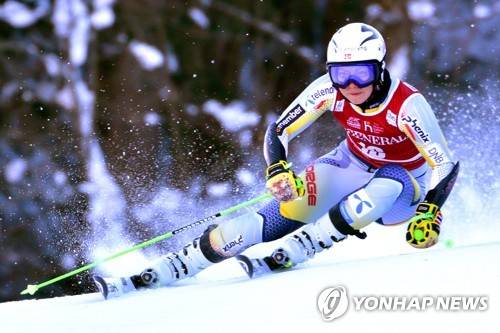 epa08941361 Ragnhild Mowinckel of Norway clears a gate during the first run of the women's Giiant Slalom race of the FIS Alpine Skiing World Cup in Kranjska Gora, Slovenia, 16 January 2021. EPA/IGOR KUPLJENIK