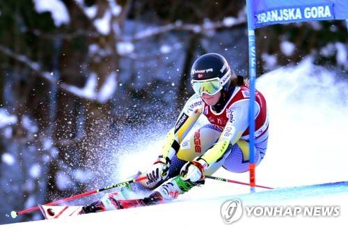 epa08941364 Mina Fuerst Holtmann of Norway clears a gate during the first run of the women's Giiant Slalom race of the FIS Alpine Skiing World Cup in Kranjska Gora, Slovenia, 16 January 2021. EPA/IGOR KUPLJENIK
