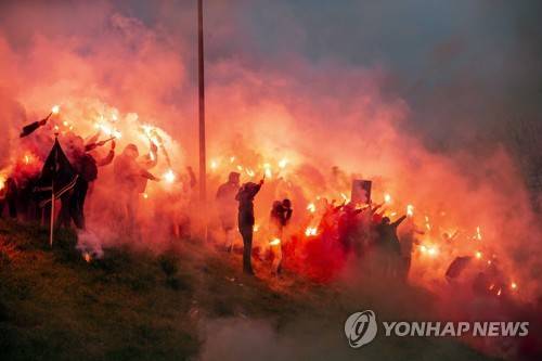 epa08941373 Supporters of Dutch soccer team Feyenoord light fireworks at the training complex during the last training in the run-up to the classic Ajax - Feyenoord on 17 January in Rotterdam, the Netherlands, 16 January 2021. EPA/PIETER STAM DE JONGE