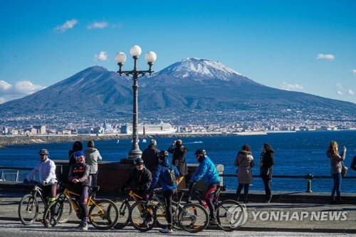 epa08941390 Snow on Vesuvius is seen from the Caracciolo seafront, Naples, Italy, 16 January 2021. The cold snap coming from Russia drops temperatures by up to 15 degrees. EPA/CESARE ABBATE