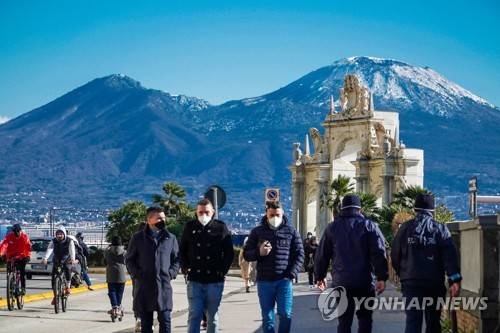 epa08941393 Snow on Vesuvius is seen from the Caracciolo seafront, Naples, Italy, 16 January 2021. The cold snap coming from Russia drops temperatures by up to 15 degrees. EPA/CESARE ABBATE