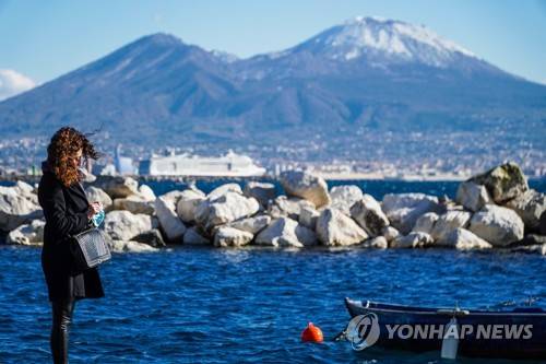 epa08941395 Snow on Vesuvius is seen from the Caracciolo seafront, Naples, Italy, 16 January 2021. The cold snap coming from Russia drops temperatures by up to 15 degrees. EPA/CESARE ABBATE