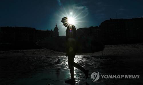 epa08941387 A surfer comes out of the water on Zurriola beach in San Sebastian, Country Basque, Spain, 16 January 2021. Spain's State Agency of Meteorology (Aemet) forecasts for 16 January foresees slightly cloudy or clear skies, with cloudy intervals in the first hours in the extreme north and temperatures with few changes except decreases in the maximums in the south. EPA/JUAN HERRERO