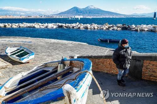 epa08941400 Snow on Vesuvius is seen from the Caracciolo seafront, Naples, Italy, 16 January 2021. The cold snap coming from Russia drops temperatures by up to 15 degrees. EPA/CESARE ABBATE
