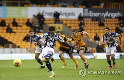West Bromwich Albion's Matheus Pereira scores his sides first goal from a penalty during the English Premier League soccer match between Wolverhampton Wanderers and West Bromwich Albion at the Molineux Stadium in Wolverhampton, England, Saturday, Jan. 16, 2021. (Carl Recine/Pool via AP) Pool Photo