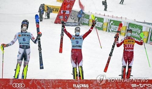 epa08941447 Manuel Feller (C) of Austria celebrates in the finish area after winning the men's Slalom race at the FIS Alpine Skiing World Cup in Flachau, Austria, 16 January 2021. Feller won ahead of second placed Clement Noel (L) of France and third placed Marco Schwarz (R) of Austria. EPA/CHRISTIAN BRUNA