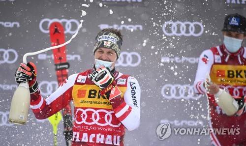 epa08941448 Manuel Feller (L) of Austria celebrates on the podium after winning the men's Slalom race at the FIS Alpine Skiing World Cup in Flachau, Austria, 16 January 2021. EPA/CHRISTIAN BRUNA