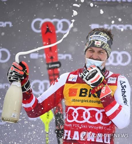 epa08941456 Manuel Feller of Austria celebrates on the podium after winning the men's Slalom race at the FIS Alpine Skiing World Cup in Flachau, Austria, 16 January 2021. EPA/CHRISTIAN BRUNA