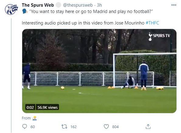 모리뉴 감독은 "이곳에 머물고 싶은가, 아니면 레알 마드리드로 가서 뛰지 않을 것인가"라고 말했다. 토트넘 소식을 전하는 '스퍼스 웹'도 "You want to stay here or go to Madrid and play no football?"라는 모리뉴 감독의 말을 정확히 잡아냈다.