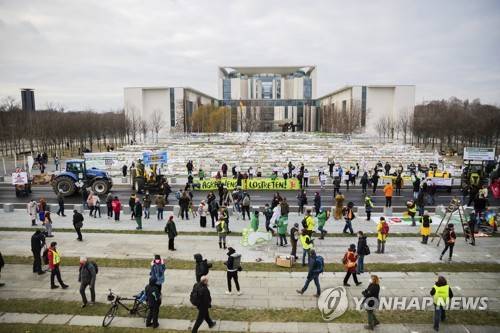 Participants of a protest under the motto "We are fed up!" against Germany's current agricultural and food policy stand with a banner in front of the Federal Chancellery in Berlin, Germany, Saturday, Jan. 16, 2021. Between the Federal Chancellery and the banner, the installation of the "Action Footprint" can be seen, where footprints and messages from people who cannot participate due to the pandemic are displayed. An alliance of around 60 organisations is calling for a rural agriculture with more environmental, animal and climate protection. (Christoph Soeder/dpa via AP)