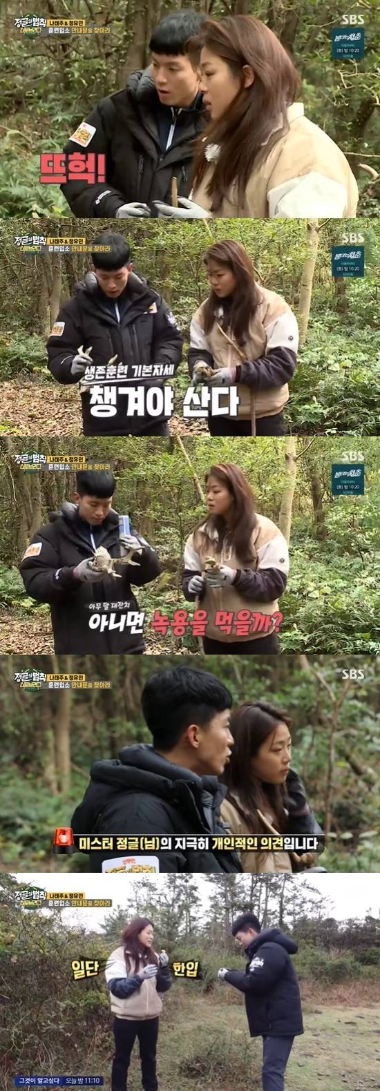 그 시각 나태주와 정유인도 훈련입소 안내문을 찾고 있었다. 정유인은 "들어갈수록 정글 같은 느낌이더라. 이런 정글이 있다는 게 놀랐다"라고 밝혔다. 정유인은 버섯을 발견하고 "이거 따가야 하는 거 아니냐"라고 했지만, 나태주는 독버섯인 것 같다고 했다. 두 사람은 노루뼈를 발견하고 깜짝 놀랐지만, 노루뼈가 필요할지도 모른다며 노루뼈를 챙겼다. 나태주는 정유인에게 "모르는 게 있으면 다 물어봐"라며 자신감을 드러냈다.