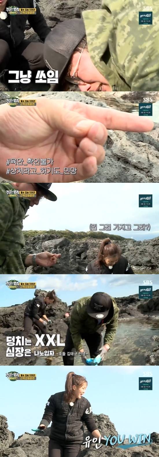 정유인, 김태균은 성게를 발견했다. 김태균은 외마디 비명을 지르며 손을 뺐다. 김태균은 "피나"라고 호들갑을 떨었지만, 정유인은 "괜찮다"라고 다시 할 일에 집중하려 해 웃음을 안겼다. 김태균은 다시 도전했지만, "가시 생긴거 봐. 칼이다"라고 두려워했다. 이를 보던 정유인은 "오빠 되게 쫄보다"라고 말하며 먼저 성게를 잡았다. 정유인은 김태균이 고전하던 곳에 가서 "어디 있냐"라고 물었고, 바로 성게를 잡았다. 정유인은 "오빠가 안에서 꺼낸 것처럼 해라"라며 성게를 넘겼고, 김태균은 성게를 들어올리다 창피해했다.