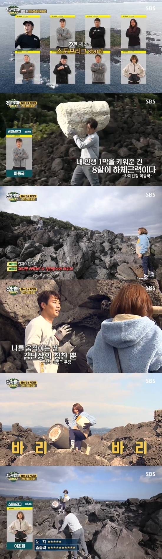 이동국은 스티로폼을 가져왔다. 이초희가 던지라고 하자 이동국은 "깨지면 어떡하냐. 나 지금 칭찬받아야 하는데"라며 김병만이 돌아볼 때 가겠다고 노렸다. 이동국은 "오로지 병만이 형한테 칭찬들으려고 가져왔다"라고 뿌듯해했다. 허재는 계속 뭘 바리바리 들고 오는 이초희에게 "너 잘 왔다. 부지런하다"라며 칭찬했다. 이초희는 "저 일 되게 못한다"라며 겸손하게 말했다.