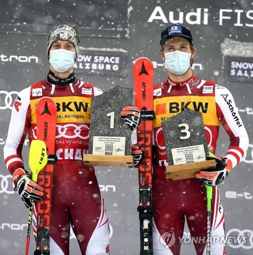 epa08941469 Manuel Feller (L) of Austria poses for photographers on the podium with his third placed compatriot Marco Schwarz (R) after winning the men's Slalom race at the FIS Alpine Skiing World Cup in Flachau, Austria, 16 January 2021. EPA/CHRISTIAN BRUNA