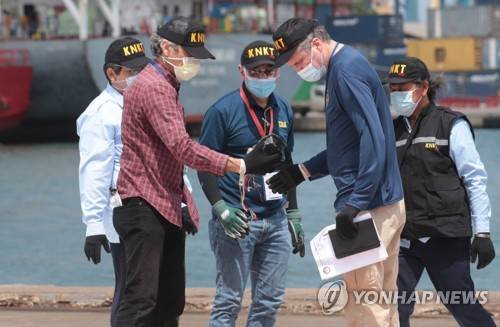 epa08941470 Two member from the US National Transportation Safety Board (NTSB) (2-L and 2-R) chat among members of Indonesia's National Transportation Safety Committee (KNKT) investigators inspecting the debris of Sriwijaya Air flight SJ 182 plane recovered from the crash site in the waters off Jakarta at Tanjung Priok port in Jakarta, Indonesia, 16 January 2021. A team from the US National Transportation Safety Board (NTSB) arrived to joint investigation of the debris of Sriwijaya Air flight SJ182 that crashed into the sea off the Jakarta coast on 09 January 2021. EPA/BAGUS INDAHONO