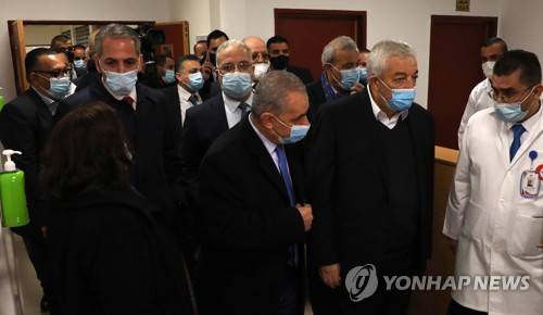 epa08941496 Palestinian Prime Minister Mohammad Shtayyeh (2-L) talks to medical staff during the opening of Al-Hilal Hospital in the west bank city of Nablus, 16 January 2021. Palestinian Prime Minister Mohammad Shtayyeh attend the opening of a new COVID-19 Hospital in Nablus City. EPA/ALAA BADARNEH