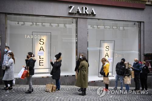 epa08941519 People wearing protective face masks line up in a queue outside the Zara clothes shop the last day of the opening of non-essential shops during the coronavirus disease (COVID-19) outbreak, in a shopping street of Lausanne, Switzerland, 16 January 2021. From 18 January, Switzerland will close non-essential shops, will demand mandatory teleworking and extend the closing of restaurants and sports facilities in a move to drastically reduce coronavirus infections. EPA/LAURENT GILLIERON