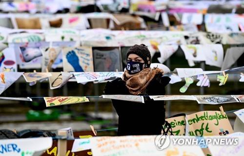 epa08941527 A protester is seen next to footprints hanging in front of Chancellery during the farmers protest called 'We are fed up!' in Berlin, Germany, 16 January 2021. Farmers protested against German government's agricultural and food policies. EPA/FILIP SINGER