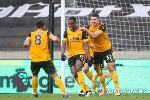 epa08941534 Willy Boly (C) of Wolverhampton celebrates with teammates after scoring a goal during the English Premier League soccer match between Wolverhampton Wanderers and West Bromwich Albion in Wolverhampton, Britain, 16 January 2021. EPA/Carl Recine / POOL EDITORIAL USE ONLY. No use with unauthorized audio, video, data, fixture lists, club/league logos or 'live' services. Online in-match use limited to 120 images, no video emulation. No use in betting, games or single club/league/player publications.
