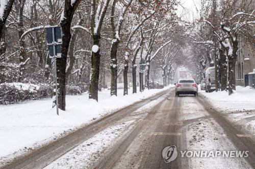 epa08941537 Cars drive on a snowy street in Lodz, central Poland, 16 January 2021. Most Polish cities are affected by the snowfalls. Meteorologists predict heavy snowfalls in some parts of the country and severe frost is expected during the weekend. EPA/GRZEGORZ MICHALOWSKI POLAND OUT