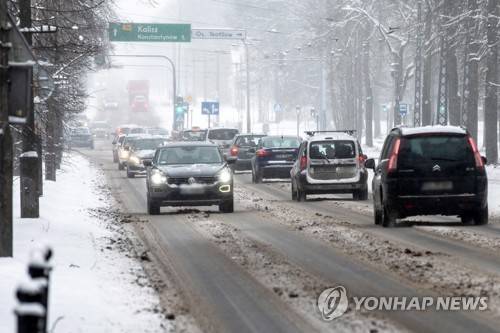 epa08941540 Cars drive on a snowy street in Lodz, central Poland, 16 January 2021. Most Polish cities are affected by the snowfalls. Meteorologists predict heavy snowfalls in some parts of the country and severe frost is expected during the weekend. EPA/GRZEGORZ MICHALOWSKI POLAND OUT
