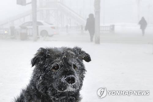 A stray dog sits in a street as the temperature dropped to about -50 degrees (-58 degrees Fahrenheit) in Yakutsk, Russia, Saturday, Jan. 16, 2021. Temperatures in the remote, diamond-rich Russian region of Yakutia have dropped to -50 degrees Centigrade (-58 degrees Fahrenheit). (AP Photo/Ajar Warlamov)