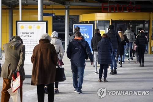epa08941565 People wearing protective face masks line up in a queue outside the Swedish furniture giant Ikea shop the last day of the opening of non-essential shops during the coronavirus disease (COVID-19) outbreak, in a shopping street of Lausanne, Switzerland, 16 January 2021. From 18 January, Switzerland will close non-essential shops, will demand mandatory teleworking and extend the closing of restaurants and sports facilities in a move to drastically reduce coronavirus infections. EPA/LAURENT GILLIERON