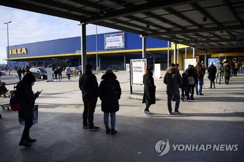 epa08941567 People wearing protective face masks line up in a queue outside the Swedish furniture giant Ikea shop the last day of the opening of non-essential shops during the coronavirus disease (COVID-19) outbreak, in a shopping street of Lausanne, Switzerland, 16 January 2021. From 18 January, Switzerland will close non-essential shops, will demand mandatory teleworking and extend the closing of restaurants and sports facilities in a move to drastically reduce coronavirus infections. EPA/LAURENT GILLIERON
