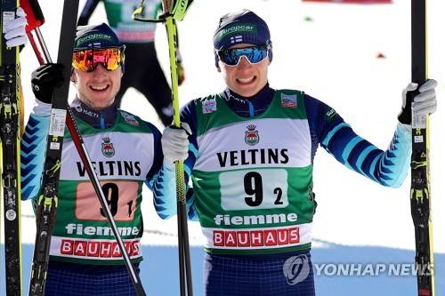epa08941600 Ilkka Herola (R) and Eero Hirvonen (L) of Finland celebrate in the finish area after taking the third place in the men's Team Sprint NH/2x7.5km competition at the FIS Nordic Combined World Cup in Val di Fiemme, Italy, 16 January 2021. EPA/ANDREA SOLERO