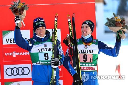 epa08941601 Ilkka Herola (L) and Eero Hirvonen (R) of Finland celebrate on the podium after taking the third place in the men's Team Sprint NH/2x7.5km competition at the FIS Nordic Combined World Cup in Val di Fiemme, Italy, 16 January 2021. EPA/ANDREA SOLERO