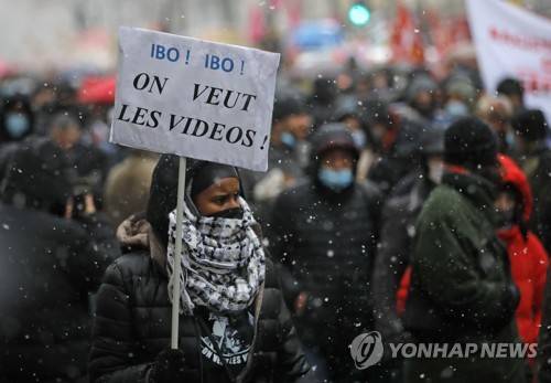 A demonstrator holds up a banner saying 'We Want the Videos' during a protest against a proposed security law in Paris, Saturday, Jan.16, 2021. (AP Photo/Christophe Ena)