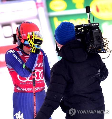 epa08941615 Federica Brignone (L) of Italy reacts during the second run of the women's Giant Slalom race of the FIS Alpine Skiing World Cup in Kranjska Gora, Slovenia, 16 January 2021. EPA/IGOR KUPLJENIK