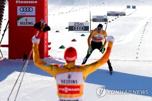 epa08941622 Eric Frenzel (front) and Fabian Riessle (back) of Germany celebrate in the finish area after winning the men's Team Sprint NH/2x7.5km competition at the FIS Nordic Combined World Cup in Val di Fiemme, Italy, 16 January 2021. EPA/ANDREA SOLERO