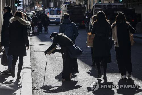 epa08941632 A beggar among people walking the streets on the first Saturday of the sales season in Rome, Italy, 16 January 2021. New restrictions to limit the spread of COVID-19 coronavirus become effective on 17 January 2021. EPA/FABIO FRUSTACI