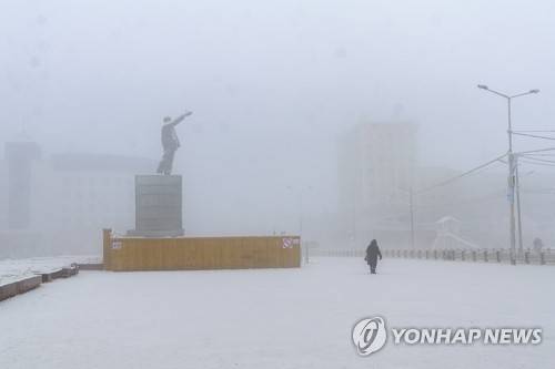 A woman walks past a statue of Soviet Union founder Vladimir Lenin as the temperature dropped to about -50 degrees (-58 degrees Fahrenheit) in Yakutsk, Russia, Saturday, Jan. 16, 2021. Temperatures in the remote, diamond-rich Russian region of Yakutia have dropped to -50 degrees Centigrade (-58 degrees Fahrenheit). (AP Photo/Ajar Warlamov)