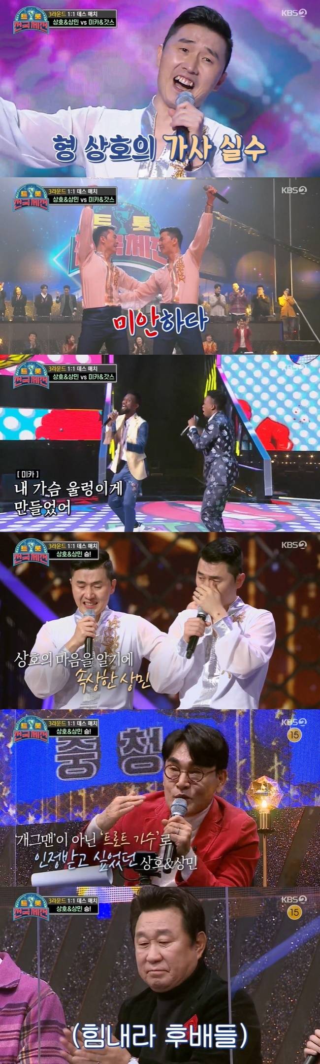 이상호, 이상민 형제는 15대 3이라는 큰 점수 차로 미카&갓스를 꺾었다. 이상호는 “저희가 질 줄 알았다. 그런데 너무 많은 표를 받았다”며 “제가 상민이한테 너무 미안하다. 가사 실수하고 그 뒤로 잘 못한 것 같아서”라고 눈물을 흘렸다.