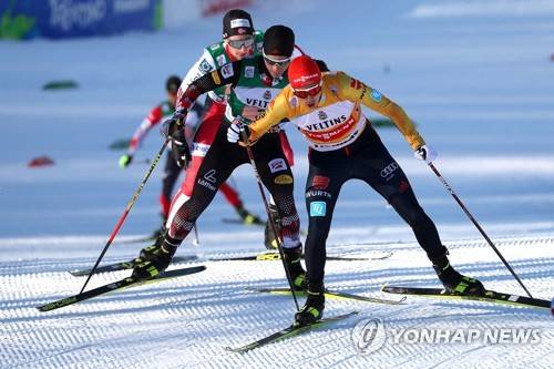 epa08941702 Eric Frenzel (front) of Germany is on his way to win the men's Team Sprint NH/2x7.5km competition at the FIS Nordic Combined World Cup in Val di Fiemme, Italy, 16 January 2021. EPA/ANDREA SOLERO