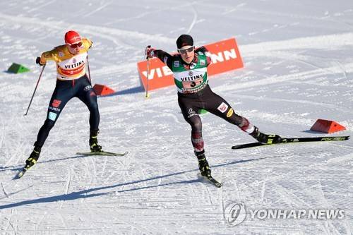 epa08941749 Lukas Greiderer (R) of Austria is on his way to take the second place in the men's Team Sprint NH/2x7.5km competition at the FIS Nordic Combined World Cup in Val di Fiemme, Italy, 16 January 2021. EPA/ANDREA SOLERO