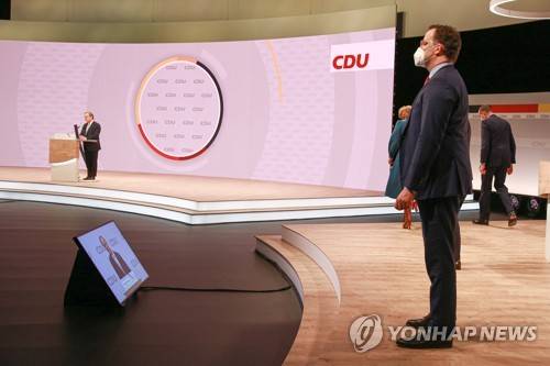 epa08941768 New chairman of the Christian Democratic Union of Germany (CDU) party, Prime Minister of North Rhine-Westphalia Armin Laschet (L) with Jens Spahn (R) during a CDU party virtual party congress in Berlin, Germany, 16 January 2021. The CDU party congress takes place on 15 and 16 January in digital format. EPA/CHRISTIAN MARQUARDT / POOL POOL