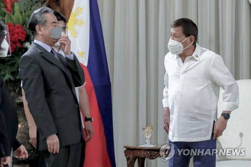 In this photo provided by the Malacanang Presidential Photographers Division, Philippine President Rodrigo Duterte, right, chats with Chinese Foreign Minister Wang Yi during a courtesy call at the Malacanang presidential palace in Manila, Philippines on Saturday Jan. 16, 2021. Wang is in Manila as part of his Southeast Asian tour that included visits to Myanmar, Indonesia, Brunei to promote China's relations in the region. (Richard Madelo/Malacanang Presidential Photographers Division via AP) AP PROVIDES ACCESS TO THIS PUBLICLY DISTRIBUTED HANDOUT PHOTO PROVIDED BY PRESIDENTIAL PHOTOGRAPHERS DIVISION ; MANDATORY CREDIT.
