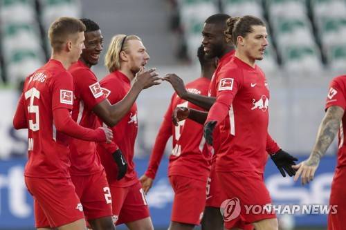 Leipzig's Nordi Mukiele, second from left, celebrates with his teammates after he scored his side's first goal during the German Bundesliga soccer match between Vfl Wolfsburg and RB Leipzig in Wolfsburg, Germany, Saturday, Jan. 16, 2021. (AP Photo/Michael Sohn, pool) POOL PHOTO