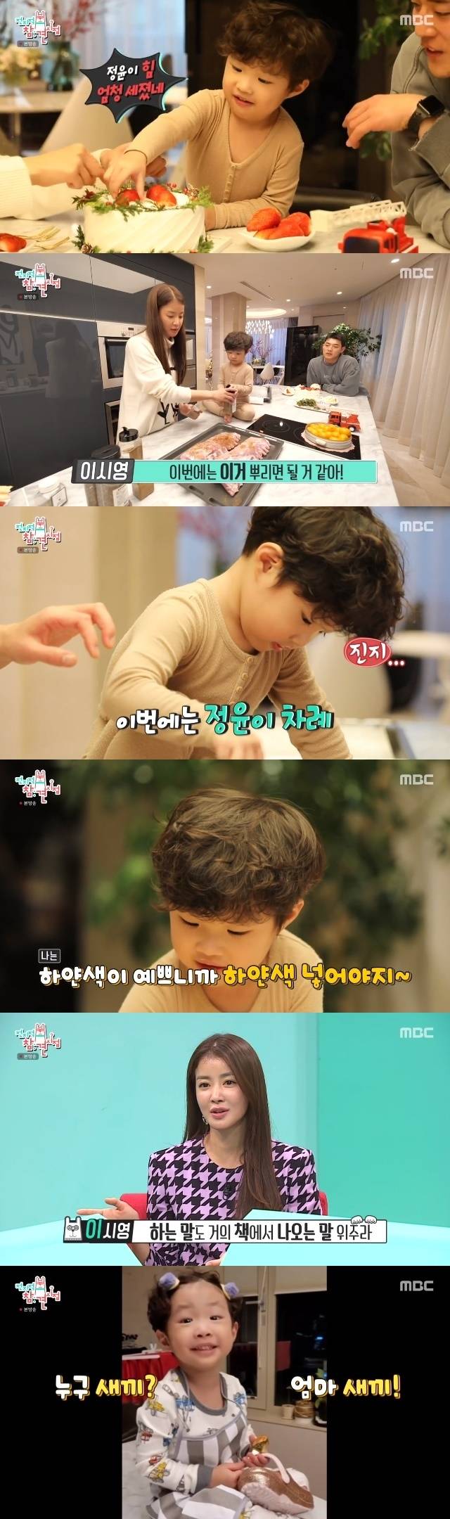 이시영은 정윤이가 정확히 몇 살이냐는 말에 "35개월"이라며 출중한 언어 능력에 대해 "(책을 많이 읽어서) 말은 좀 빠른 것 같다. 하는 말들이 책에서 나온 말들 위주로 한다"고 밝혔다. 이시영은 정윤이가 한 의외의 말로 "어이구 내 새끼 하니까 새끼가 뭐냐고 하더라. 그런 건 책에 없으니까. 아기들은 새끼라고 설명하니 그러면 나는 엄마 새끼네 하더라"고 전했다. (사진=MBC '전지적 참견 시점' 캡처)